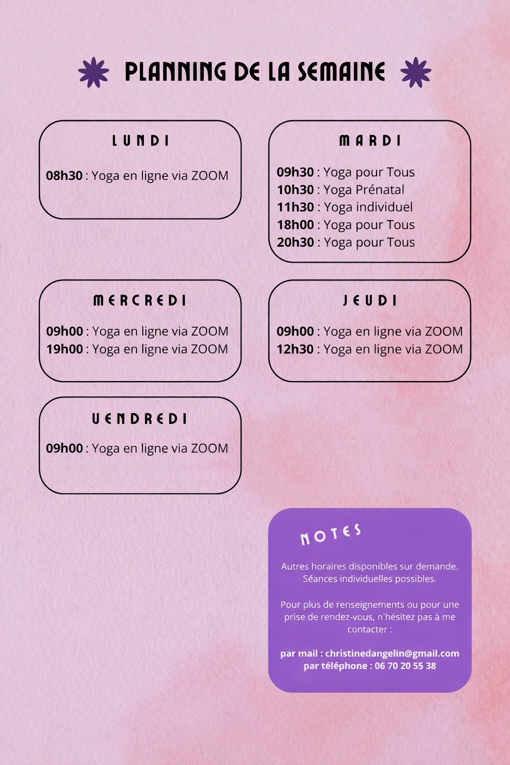 Planning Retrouvez le planning de mes séances Formulaire de contact Formulaire de contact Posez-moi une question ou prenez rendez-vous ci-dessous Prénom * Nom * Email * Téléphone * Message * J'ai lu et j'accepte la Politique de Confidentialité 14 + 15 = Envoyer le message 06 70 20 55 38 11 quai de Serbie, 69006 Lyon christinedangelin@gmail.com
